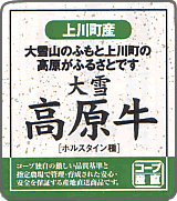 北海道大雪山連峰の麓の豊かな湧き水と広大な大自然の中で農薬を一切使用しない牧草を主体に『大雪高原牛』を生産しています 『大雪高原牛』は、コープさっぽろの産直牛肉とし2009年の「第6回コープさっぽろ農業賞 北海道知事賞」を受賞、消費者が応援したい生産者NO.1に選ばれました。 安心・安全を追求した『大雪高原牛』は、「生まれも育ちも上川町」、子牛から成牛まで上川町内で一貫生産(一部上川管内産市場導入)されています。農業も機械化が進む中で、餌も人の手で1頭1頭に与え大切に育てています。 |
